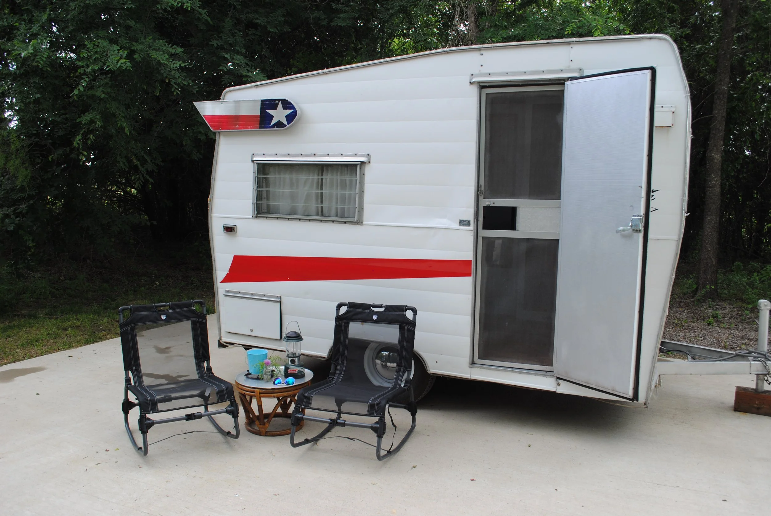 Peggy Hill is a '67 Shasta Compact with a Texas theme. She sleeps 2 people & has working ac, water, ref & microwave.
